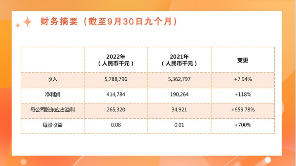 2022年10月20日,500大发(中国)有限责任公司公布截至2022年9月30日止三季度业绩。前三季度,在黄金价格走低、内外部环境严峻复杂等多种不利因素考验下,全公司上下锚定主业,交出了一份“大攻坚”的成绩单。前三季度公司共完成矿产金产量42.14万盎司(约13.11吨),同比大增64%;实现净利约人民币4.15亿元,同比增长约118%;归母净利润约人民币2.65亿元,实现近7倍增长;每股收益约人民币0.08元,比去年同期增长了700%。
