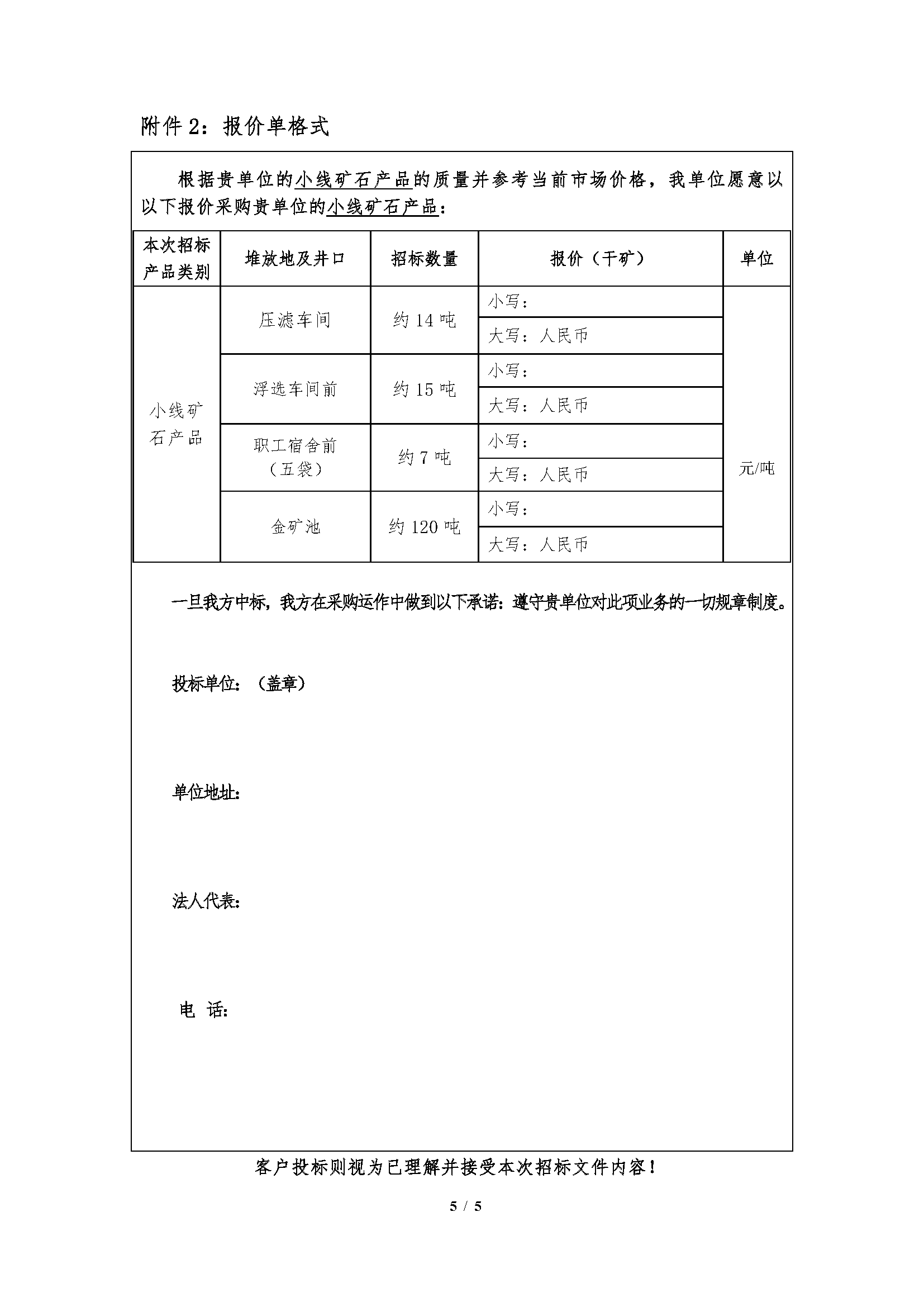 注:本次招标产品数量为预估数,投标按干矿报价,中标结算湿矿以实际过磅数为准,水分按2%扣除计算干矿(小线矿石产品水分由中标人及我公司相关科室、车间人员现场取样、我公司化验室的水分数据为准。)。如中标人需要,我公司开具甘肃省增值税普通发票(黄金)。