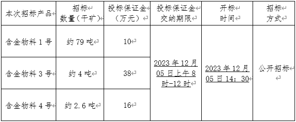 本次招标副产品为我公司含金物料。投标人需提供“三证合一”的营业执照复印件(个人提供身份证复印件)、法人授权委托书(原件)并加盖企业公章,于2023年12月04日12:00前将上述材料送交我公司财务科进行审核,审核合格后的单位应于2023年12 月 05日上午8时-12时交纳投标保证金(见下表,保证金须以转账方式支付)。如在2023年 12 月 05 日上午12时前投标保证金未足额汇入我公司账户则视为放弃本次投标;若投标人最终未中标,则由投标人开具收款收据后,我公司将一次性无息退还投标保证金。