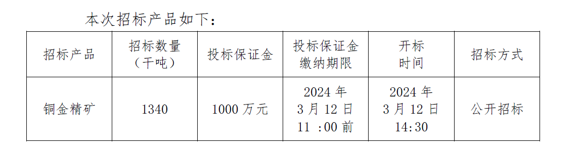 本次招标产品为我公司铜金精矿。投标人需提供“三证合一”的营业执照复印件(个人提供身份证复印件)、法人身份证复印件、法人授权委托书(原件)、被授权人身份证复印件,并加盖企业公章,于2024年3月11日11:00前将上述材料送交我公司财务科进行审核,审核合格后的单位应于2024年3月12日11 :00前交纳投标保证金(见下表,保证金须以转账方式支付)。投标保证金交纳金额与我公司招标文件要求不符的、投标保证金未及时到账的视为废(弃)标。若投标人最终未中标,则由投标人开具收款收据后,我公司将一次性无息退还投标保证金。