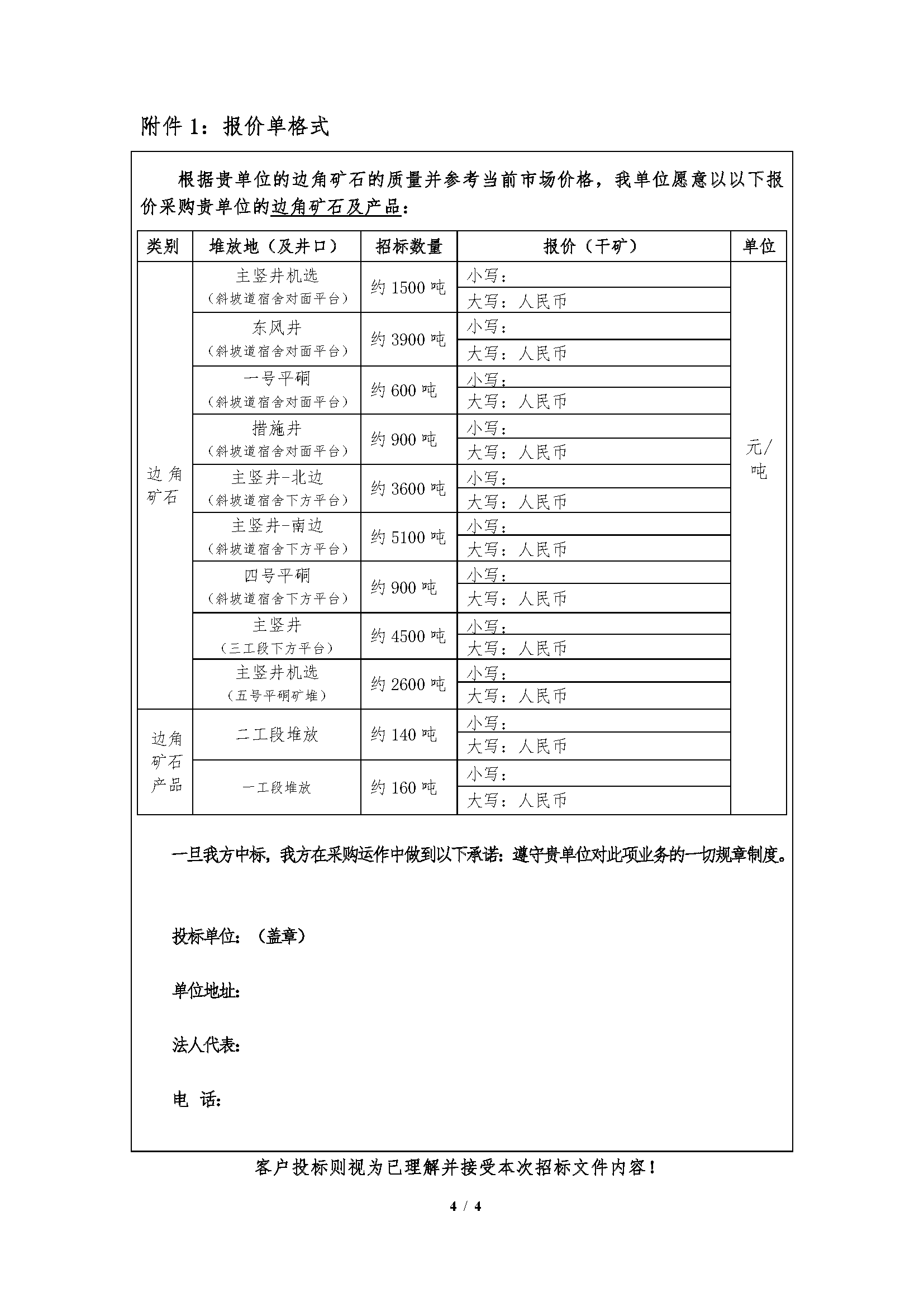 4.如无异议,请投标人将此招标文件和报价单加盖企业公章(或按捺手印)原件扫描后发送至指定投标邮箱;报价单所需填写的数据原则上要求电子版,若手写须大小写注明,如有涂改、不清晰或大小写不一致的视为废标。其他未尽事宜,以中标后签订的合同条款约定为准。