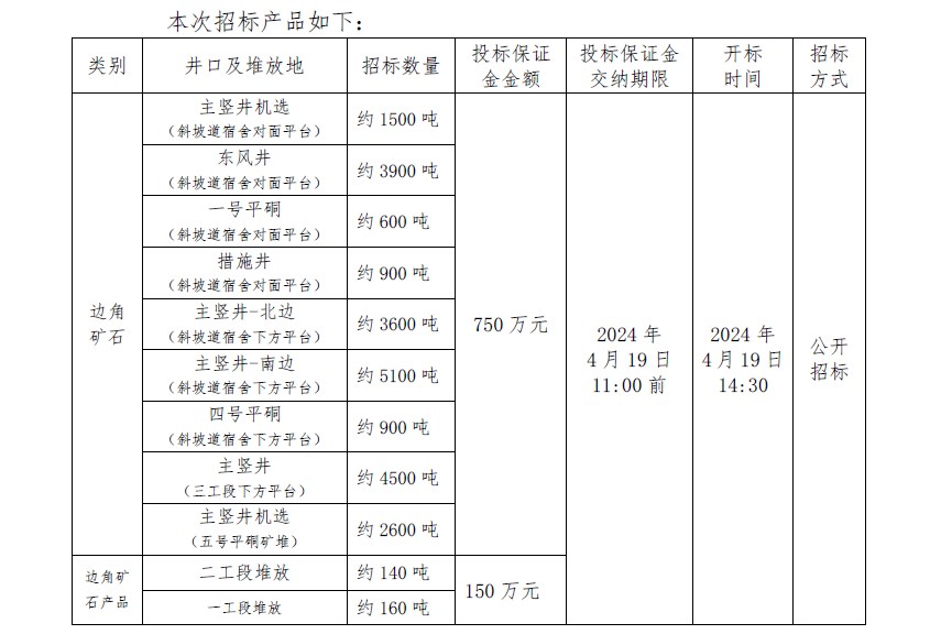 注:本次招标产品数量为预估数,投标按干矿报价,中标结算湿矿以实际过磅数为准,水分按2%扣除计算干矿;边角矿石产品水分由中标人及我公司相关科室、车间人员现场取样、我公司化验的水分数据为准。如中标人需要,我公司开具甘肃省增值税普通发票(黄金)。